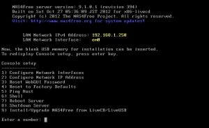 Операционная система устанавливается, если готовы необходимое оборудование и периферия. Процесс установки дистрибутива не занимает много времени. На скриншоте ниже показано, как происходит запуск live-версии ОС, с этого начинается установка. Особо следует обратить внимание на IP-адрес, который будет нужен позже для конфигурации NAS4Free. Логин / пароль для входа – admin / nas4free.
