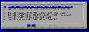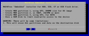 Действия, описанные ниже, актуально применять при загрузке сборки 1310 с измененной схемой разбивки USB-накопителя и установочного меню для embedded-установки версии FreeBSD 9.3. Именно embedded является рекомендуемой версией для установки дистрибутива по умолчанию. При установке на USB-накопитель минимальный необходимый объем флешки должен быть равен 2 Gb. Требования к оборудованию повышаются в зависимости от использования большего количества функций системы и более усовершенствованных технологий. Например, чтобы улучшить хранилище данных через системуZFS, нужен 64-зарядный процессор с более высокой производительностью, нежели Intel Atom, также потребуется минимум 2 Gb оперативной памяти, но если вам понадобятся расширенные функции, то и этого будет недостаточно. Чтобы активизировать технологию prefetch для повышения производительности файловой системы, необходимо 4 Gb ОЗУ, а чтобы эта технология работала в нормальном режиме, лучше повысить объем до 8 Gb. На старом и слабом железе ZFS обычно не используется, минимум, что может понадобиться на таком устройстве, не менее 512 Mb RAM, при отключении swap этот показатель можно повысить до 1-2 Gb.