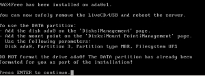 Затем указываются источник и место инсталляции, могут быть использованы следующие варианты: cd - для оптических дисков, da - для USB-накопителей, SAS и SCSI-диски , ad и ada – ATA и SATA-диски. После этого необходимо создать файл подкачки. Swap-раздел не требует создания и не устанавливается через интерфейс, если в наличии имеется более 2 Gb памяти.